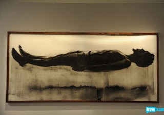 I am pleased to say that my favorite from the beginning, Abdi, actually won the competition. Some of his pieces early in the competition made him a front-runner for me; and then he seemed to suffer from an identity crisis midway through the competition. When the artists were asked to create a piece inspired by nature, Abdi returned trimphant with an amazing self-portrait/baptism piece inspired by the body of water visited by the artists and rendered in charcoal that he mixed with gravel obtained during the visit to the woods. With the wind at his back following his win, for the final challenge, Abdi created an entire show devoted to studies of the body based on his “baptism” piece (see above). Meanwhile, in the finale, two other artists, Miles, who had generally succeeded in each challenge despite the fact that his work, for me, was largely cold and mechanical and Peregrine whose work was generally moody and often childlike, and whom I had thought would have been eliminated in an early round, also created a show for the Phillipe de Pury auction house.