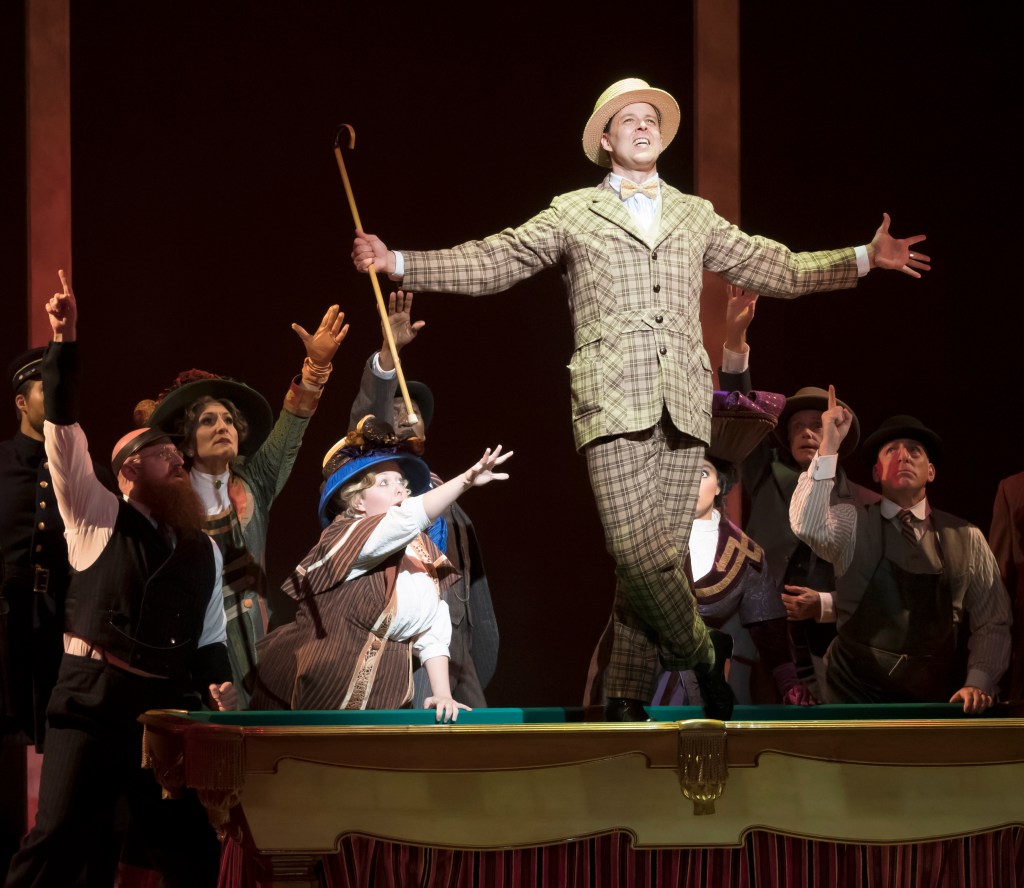 Hill gets the elder statesmen (Joseph Torello, Branch Woodman, Mel Johnson, Jr., and Jack Doyle) to form a mighty fine barbershop quartet – causing them to put aside their feuds in favor of sweet music. Then, he flatters the Mayor’s wife, Eulalie Shinn, a winning Matthew McGee in drag, so that she will lead the local gossiping ladies in movement tableaus to hilarious effect. Hill even straightens out town ne’er do well Tommy Djilas (Raynor Rubel) who is infatuated with the adorable Mayor’s daughter Zaneeta Shinn, played by Marie DiNorcia, in her Asolo debut, which is hopefully the beginning of a long association with this lovely actress. Rubel and DiNorcia lead an incredible group of dancers to transition from balletic moves to tap in a couple of amazing numbers – first quietly in the library and then in all out ebullience at the town gazebo.