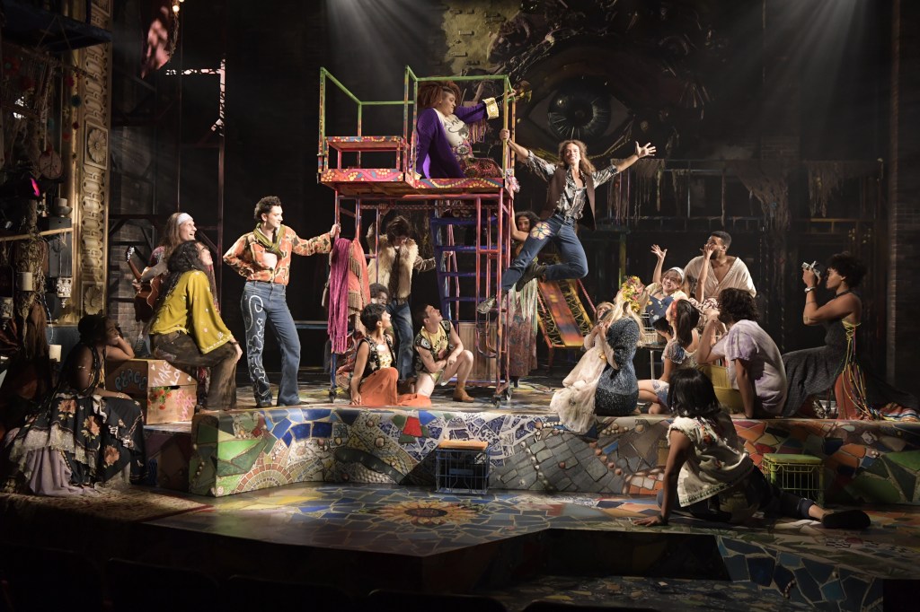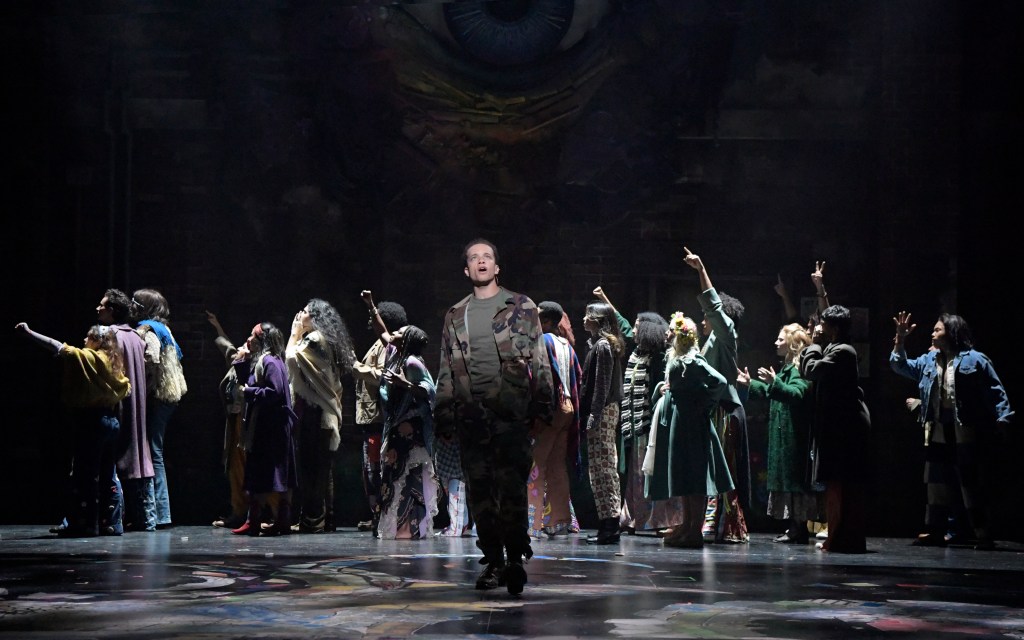 When you enter the theater, the cast has begun interacting with one another and the audience. A huge third eye at the top stage sets the mood, and a leader of the tribe named Berger (Kaleb Wells) careens down the rainbow slide at the center of the stage espousing his love of transcendental meditation. This line was greeted by a few laughs, but I was struck by the extent to which mindful meditation has been mainstreamed as a part of the $4.2 trillion wellness industry. Perhaps people are less likely to refer to the practice as transcendental, but there is no question that the tribe depicted in “Hair” were decades ahead in ascribing to the value of meditation.