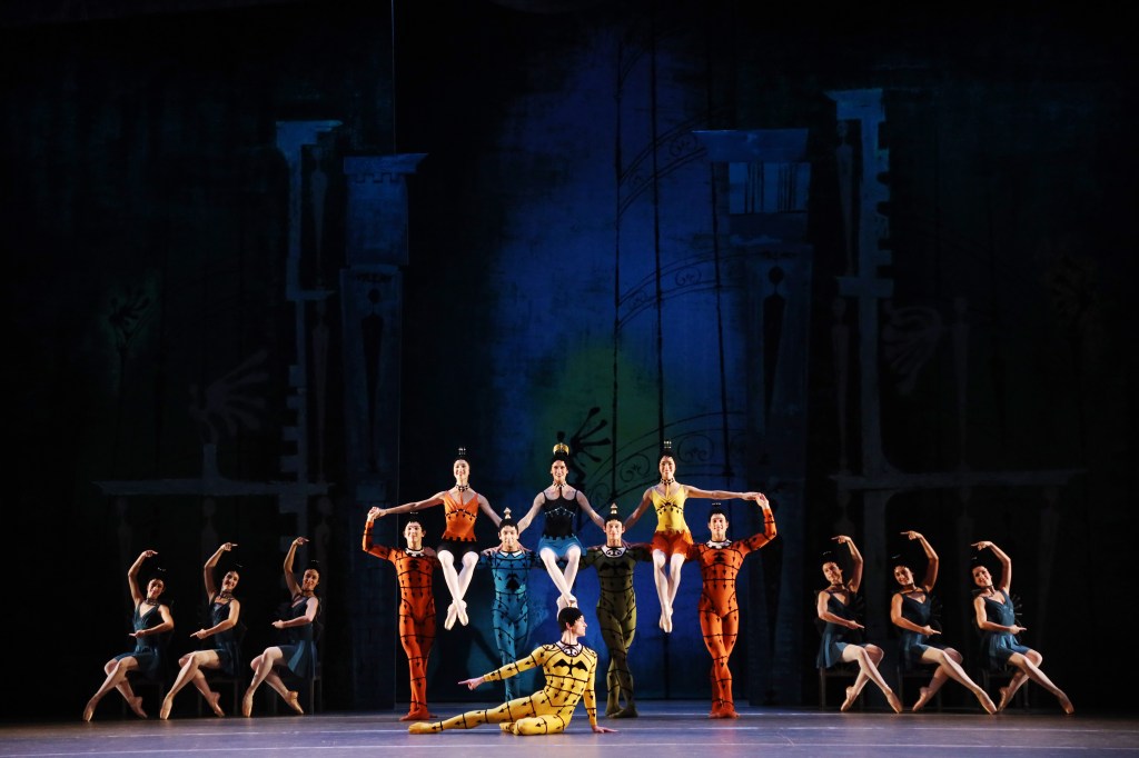 The first piece of the evening, MacMillan’s “Danses Concertantes,” was notable for very unusual costumes, precise movements, and the energized Stravinsky score performed by a live orchestra. The orchestra provided a fuller experience filling the gaps among the dancers who were less recognizable with their eyes frequently masked and with their heads covered with tight black head caps with ornaments perched atop their heads designed by Nicholas Georgiadas.